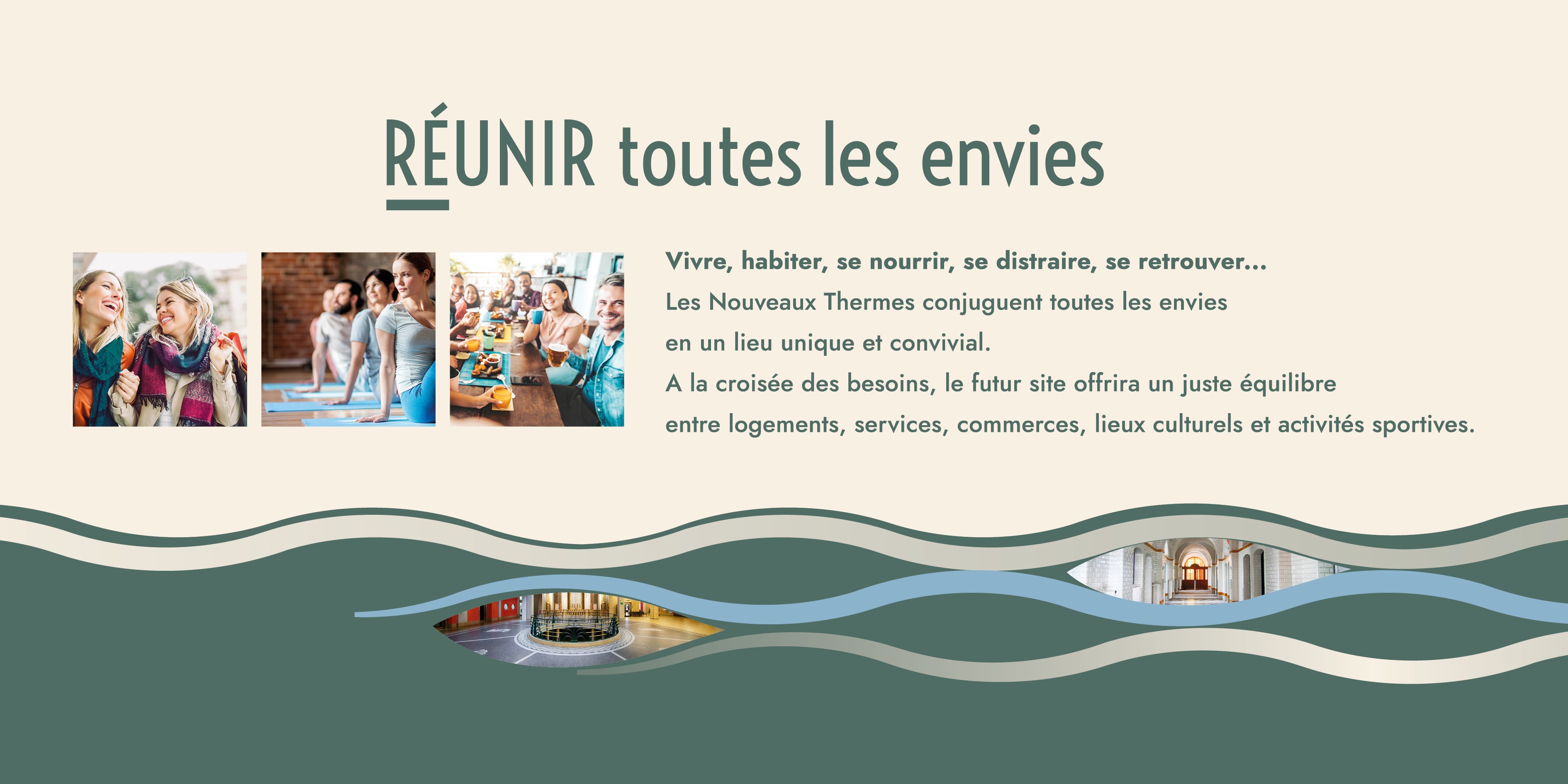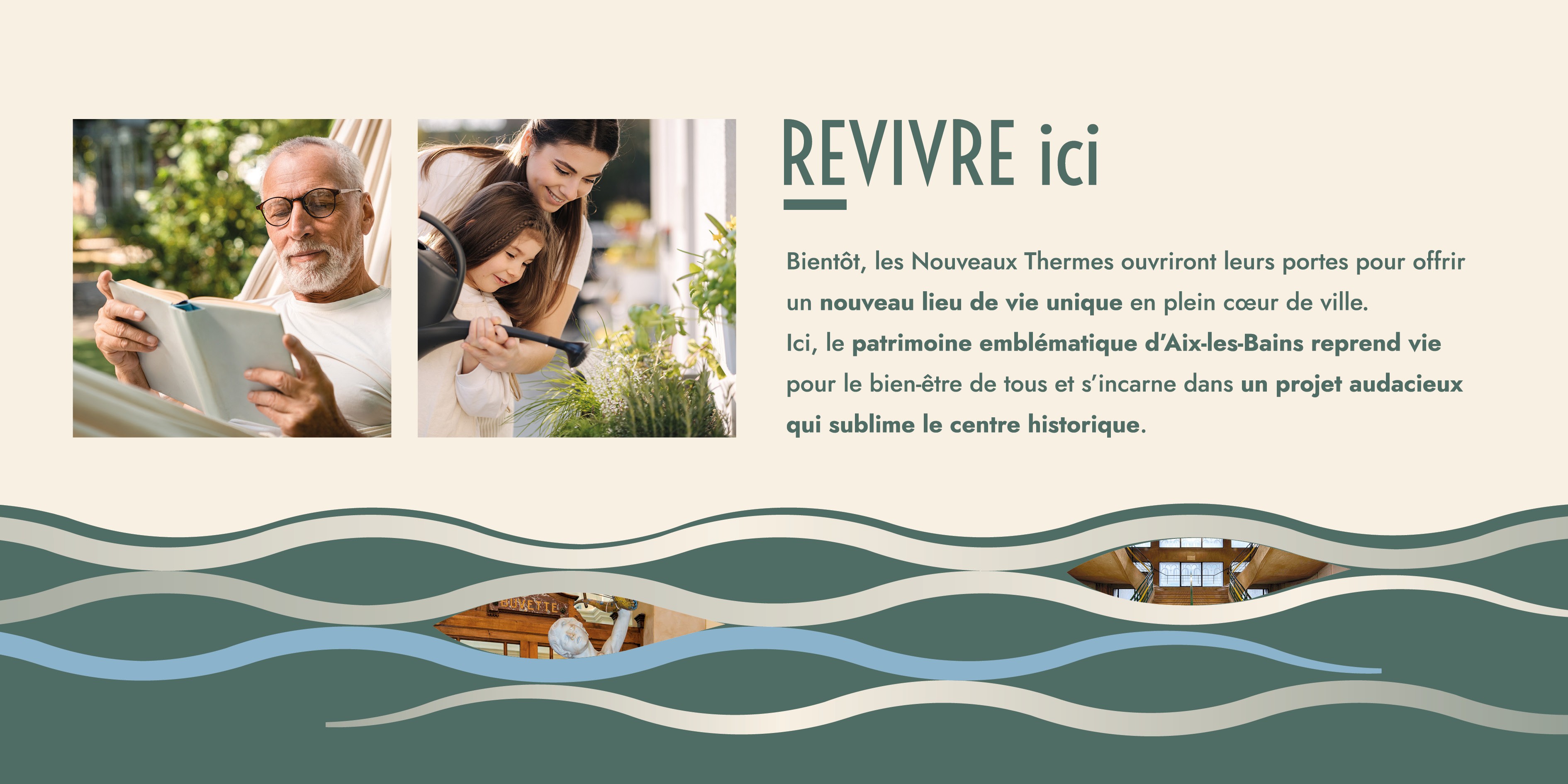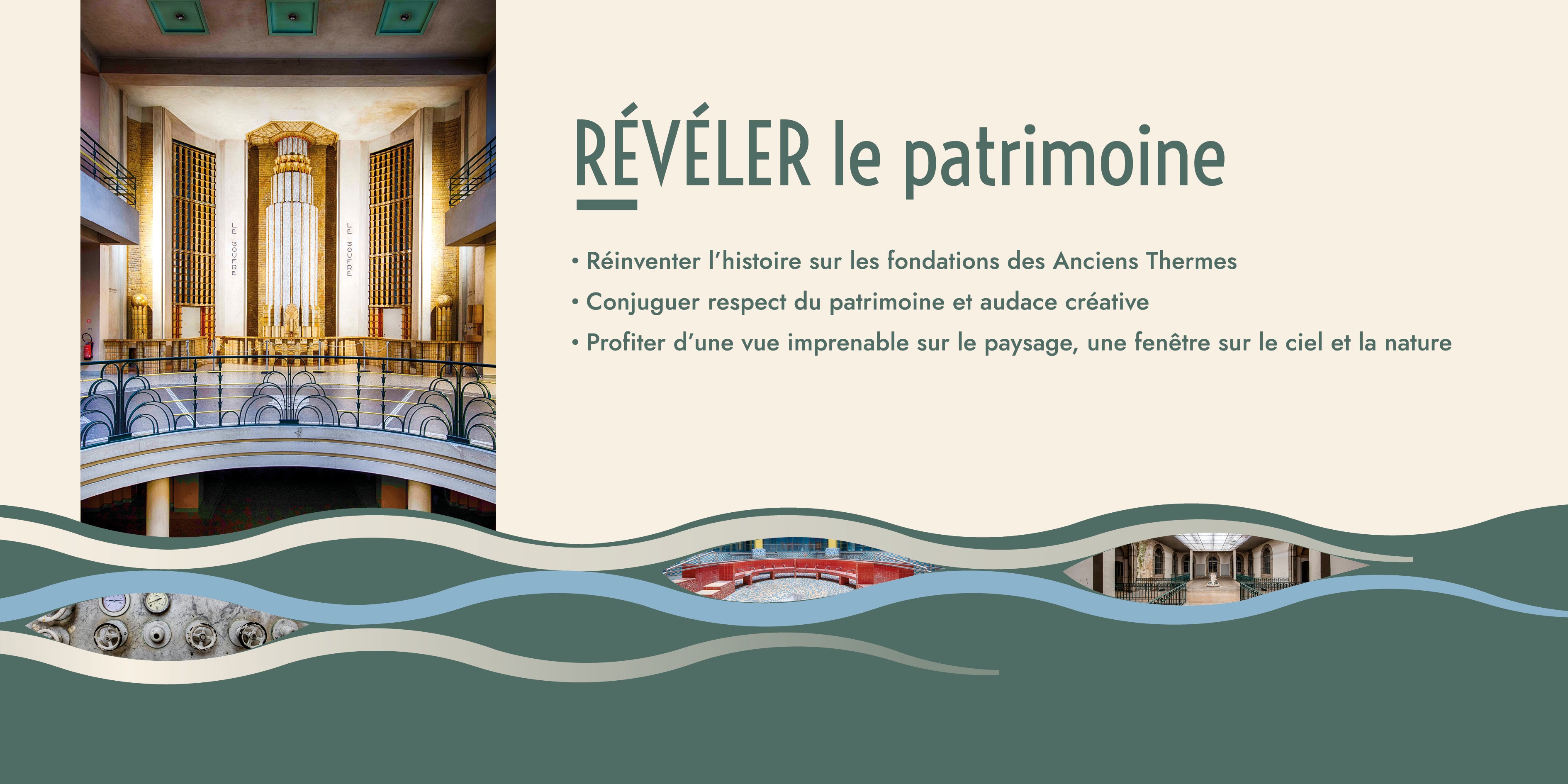 Création de l’identité visuelle et du territoire graphique du projet, en collaboration avec l’agence Esprit des Sens. Co-promotion Bouygues Immobilier et la Société d’aménagement de la Savoie, dans le cadre de la réhabilitation des anciens thermes d’Aix-les-Bains. Ce haut-lieu patrimonial emblématique de la ville fait l’objet d’un programme mixte mêlant offre de commerces, de services et habitat, la partie logements ayant été confiée à l’architecte de renommée internationale Vincent Callebaut