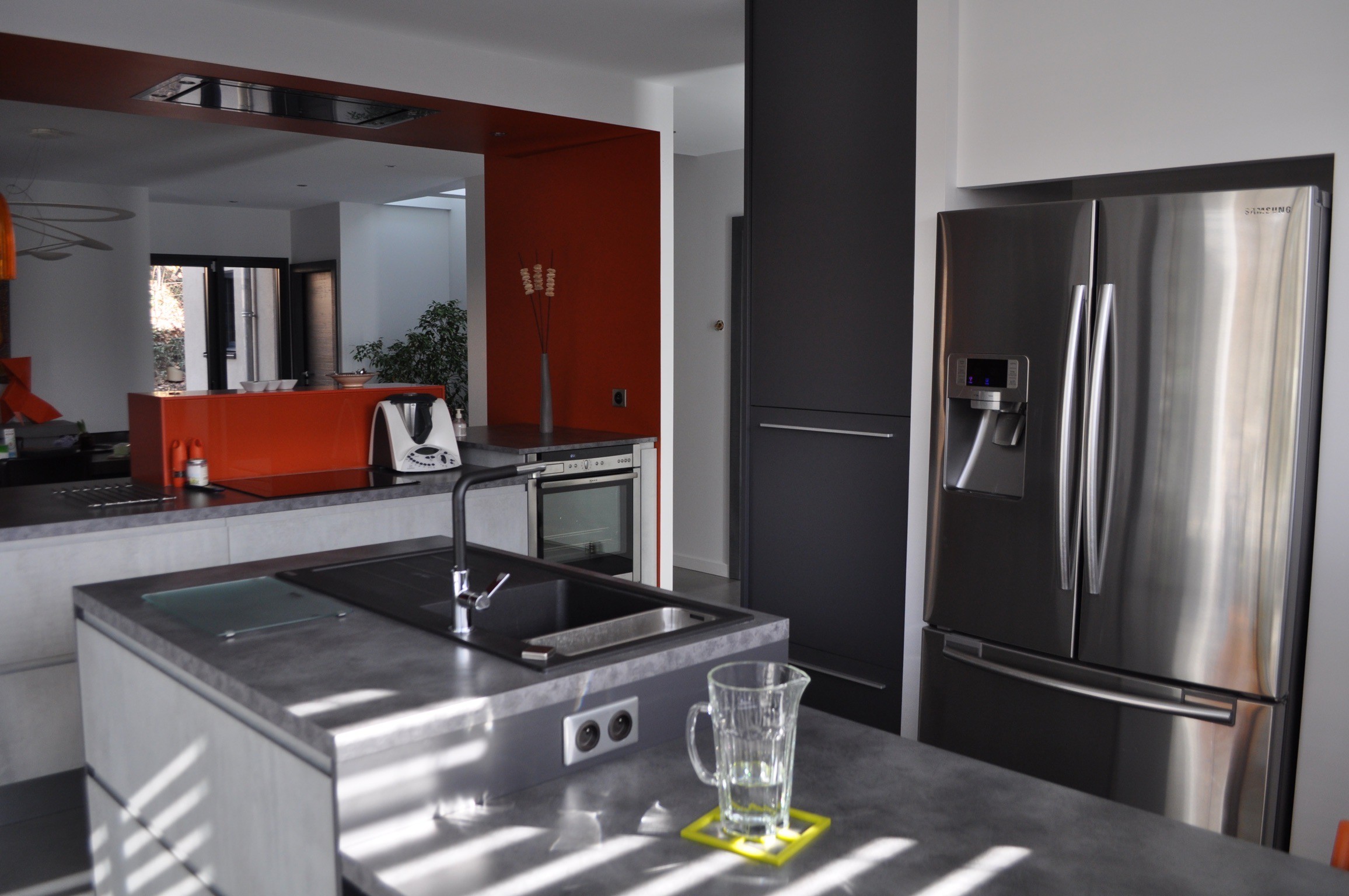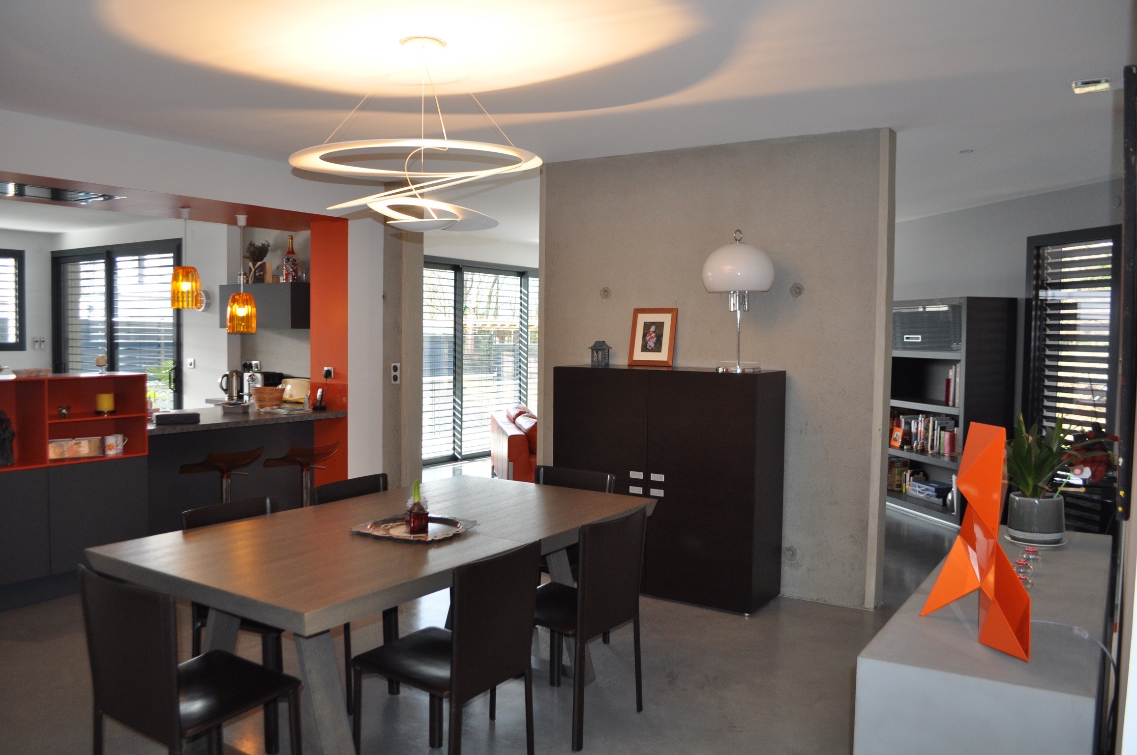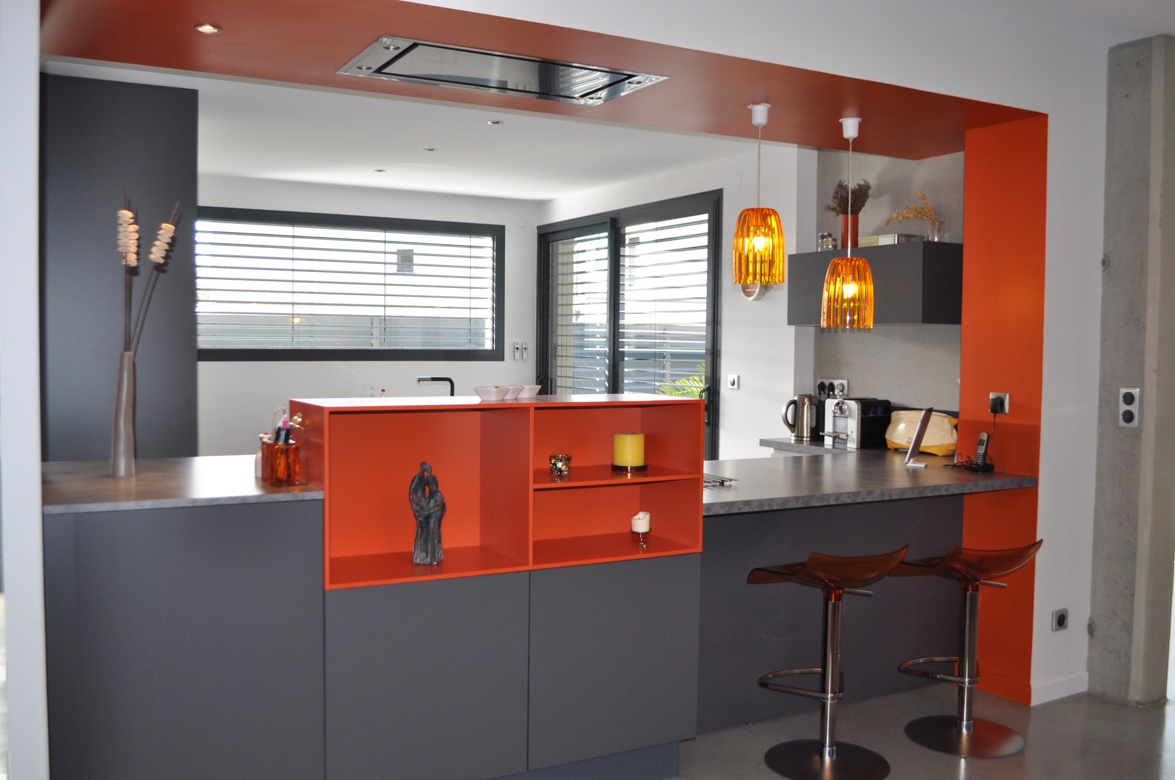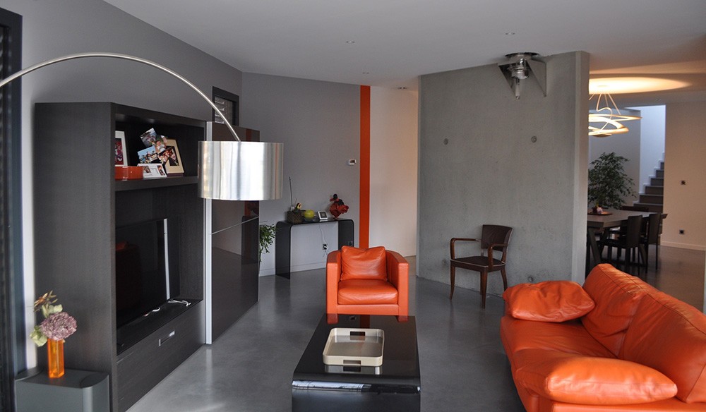 Création d’une ambiance moderne et épurée dans les tons gris béton et orange vif.