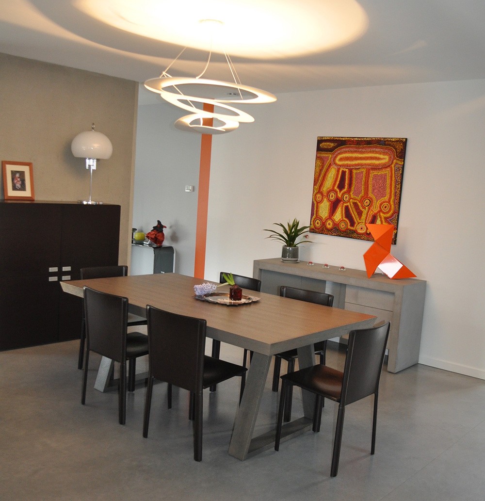Création des ambiances couleurs et matières : choix des peintures, menuiseries intérieures, du revêtement de sol (béton ciré), des luminaires et de la décoration.